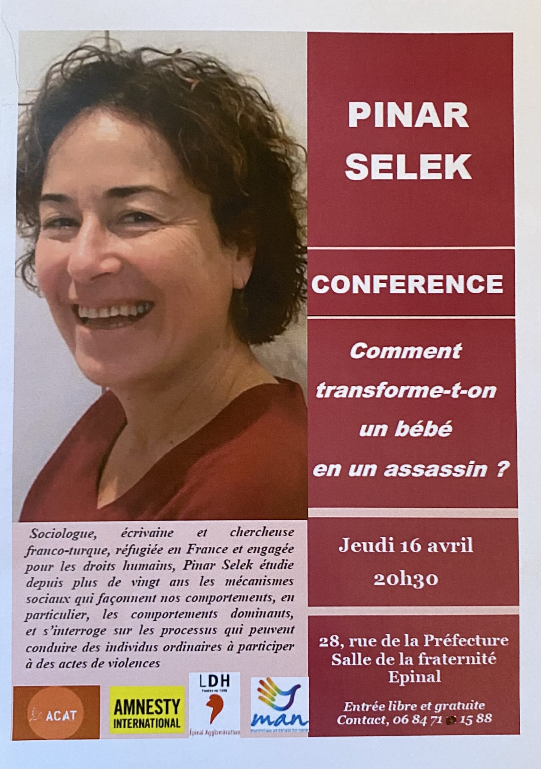 La conférence organisée par l’ACAT Epinal, mouvement chrétien engagé pour la défense des droits de l’homme, est soutenue par Amnesty International, la Ligue des Droits de l’Homme, groupe Epinal et le MAN, mouvement pour une alternative non violente.